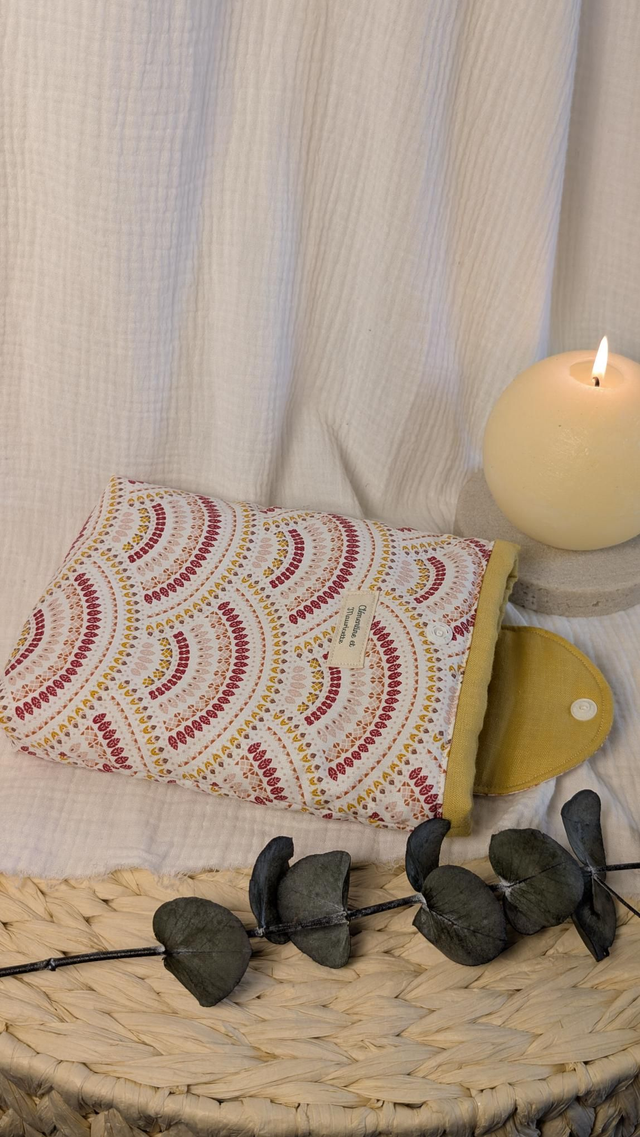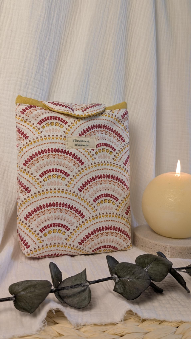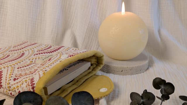 Pochette à livre molletonnée , format poche, fermeture par rabat + bouton pression, cousue main et pensée pour emporter vos lectures partout.